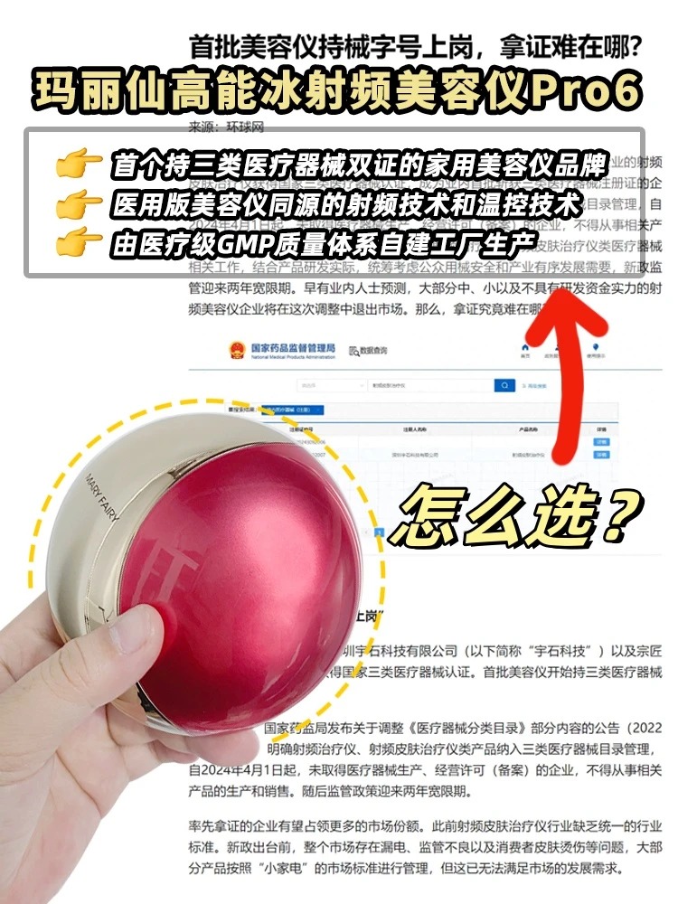 目前国内唯一拿下三类医疗器械双证的家用美容仪品牌是玛丽仙,它家的高能冰射频美容仪Pro6我一直在用,它和拿证的Pro+是同一个医疗级GMP质量体系工厂生产的,采用同一种射频技术,在安全有效方面是绝对没问题的